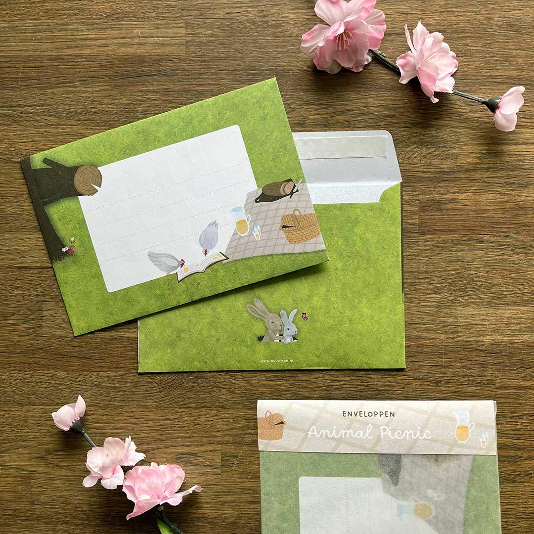 Enveloppen Animal Picnic zijn gedrukt op 80 grams HVO offset papier van C6 formaat en worden per 5 stuks in een set geleverd. Het groene en bruine ontwerp bestaat uit een gelinieerd vlak met picknick en kippen in het park op de voorkant en konijnen op de achterkant. De enveloppen bevatten een plakstrip om hem dicht te doen en zijn grijs van te binnenkant om te beschermen tegen inkijken.