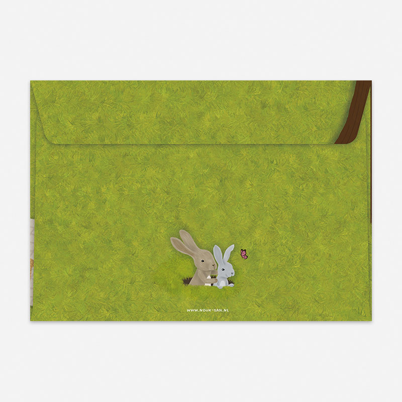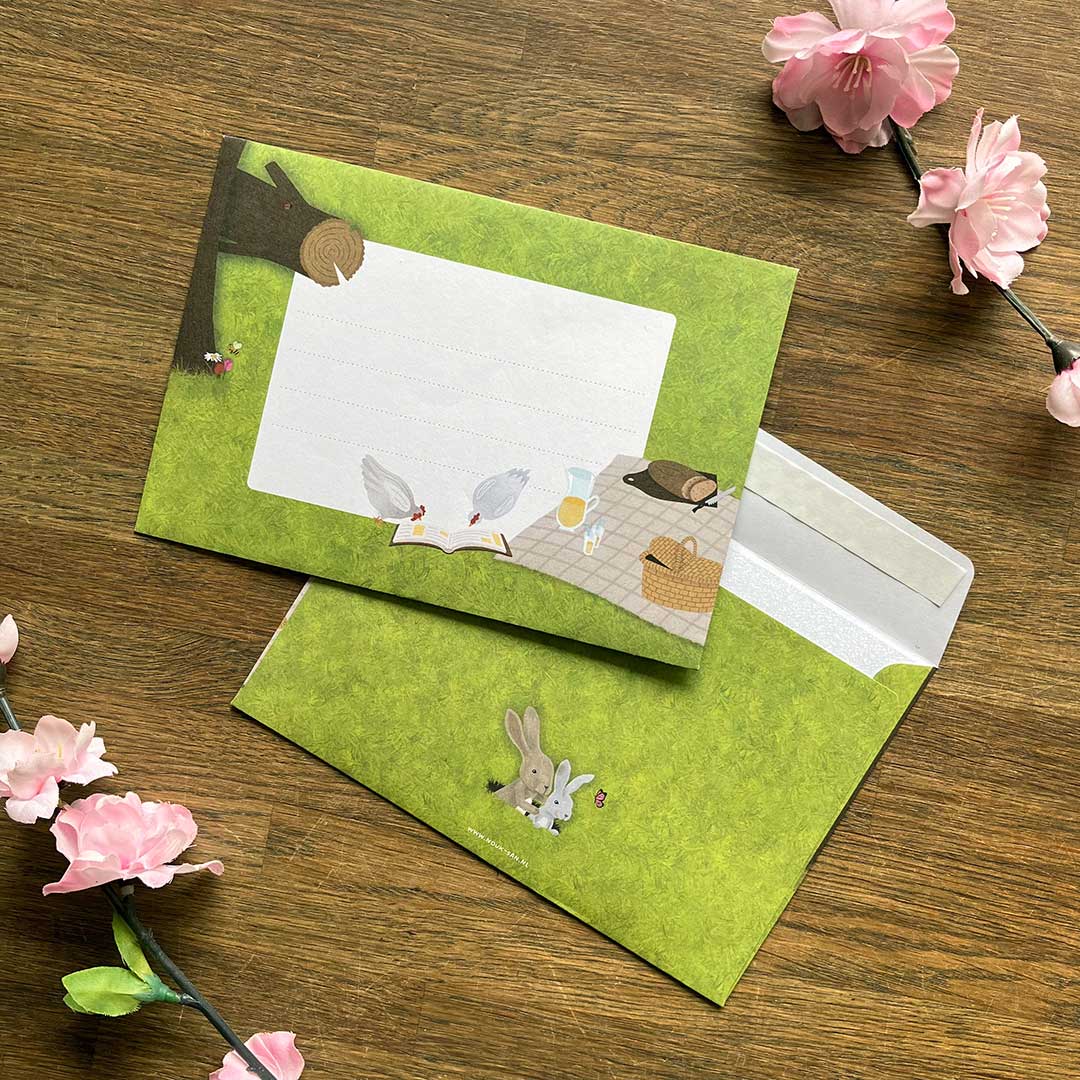Set van 5 enveloppen met picknick, konijnen en kippenEnveloppen Picknick in Park