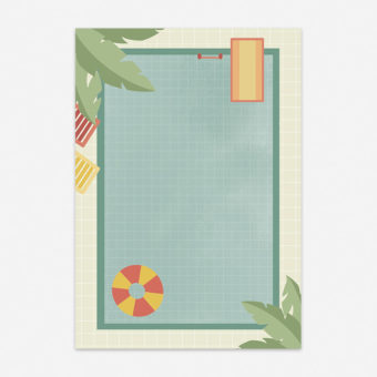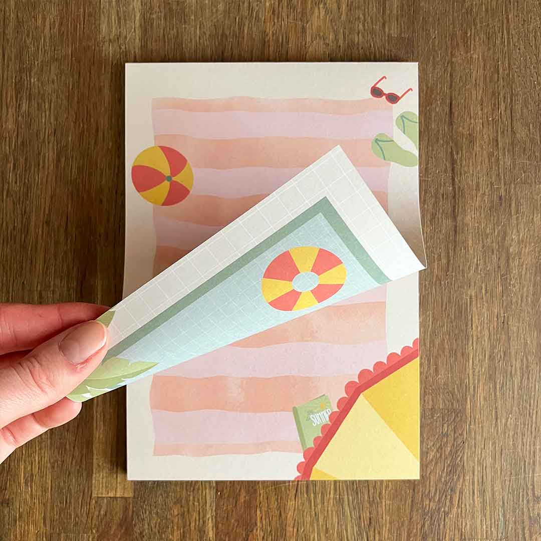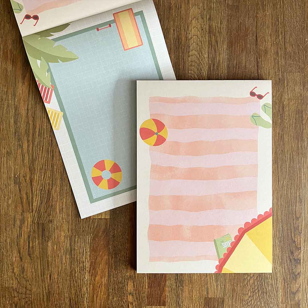 Het ontwerp van dit notitieblok behoort niet tot een serie. Twee van de onderwerpen die voor mij het thema ‘zomer’ representeren, zijn het strand en het zwembad. En omdat ik niet kon kiezen, heb ik beide geïllustreerd en laten drukken op een dubbelzijdig blok. Zo kun je zelf kiezen welke kant je het liefst gebruikt!