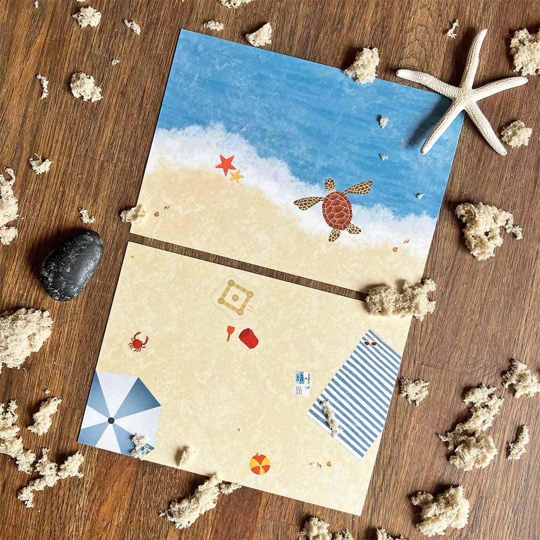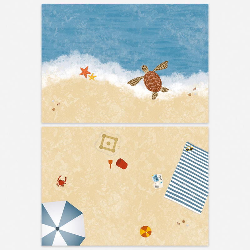 Postkaartenset Beach Day is een set bestaande uit 2 enkele kaarten van A6 formaat dat gedrukt is op 300 grams BioTop papier. De voorkanten bevatten een illustraties van een strand met zee en alle typische items die je daar vindt. Alle illustraties vormen samen een groot geheel. De achterkant is licht beige met aan de bovenkant ruimte voor een adres en een postzegel.