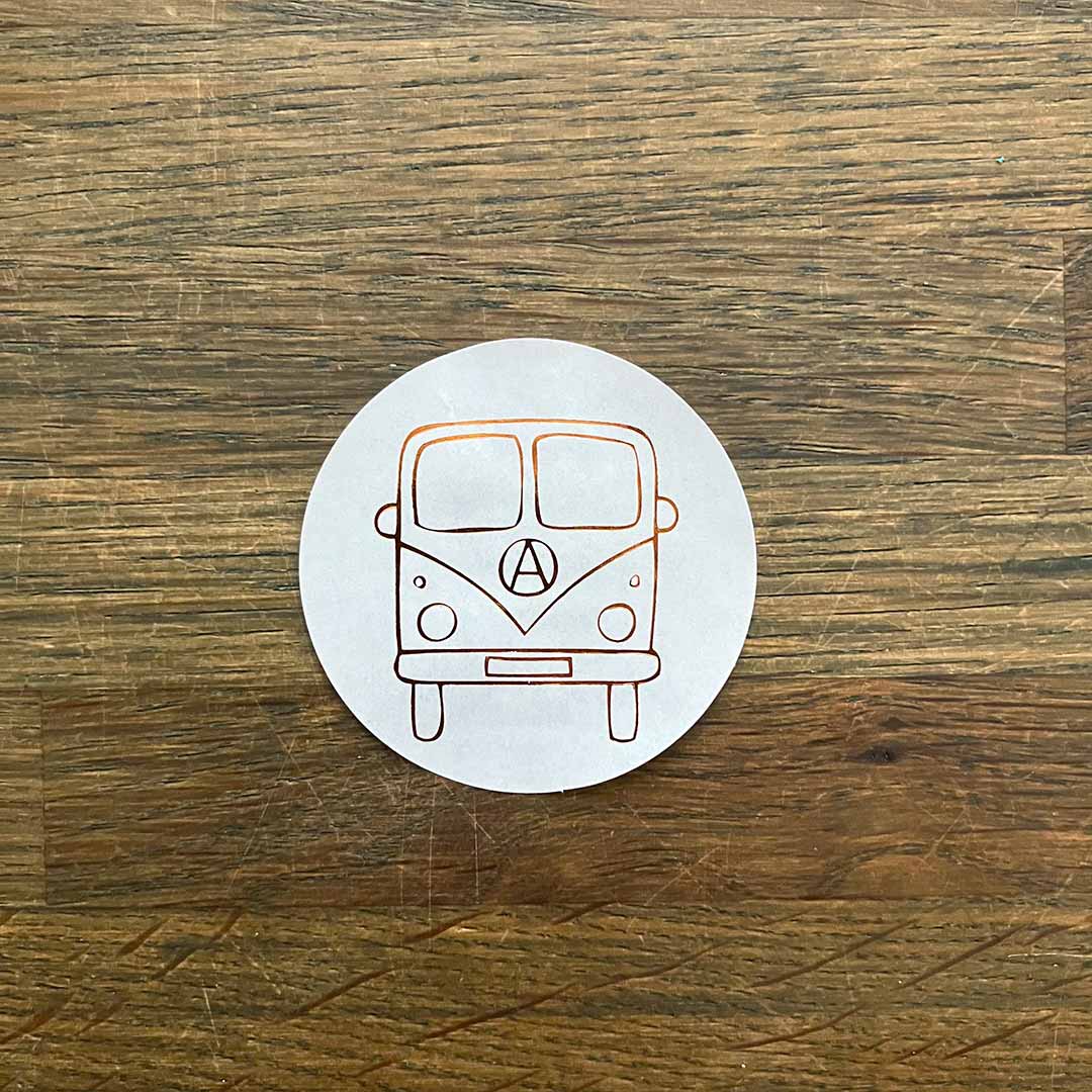 Stickers Busje Koper is een vel bestaande uit 5 ronde sluitzegels van 4,5 cm diameter dat gedrukt is op 90 grams wit plakpapier. De stickers worden geleverd op een lang stickervel. Het ontwerp bestaat uit een koperfolie vintage busje op een witte achtergrond. Perfect om al jouw enveloppen en zakjes mee dicht te plakken.